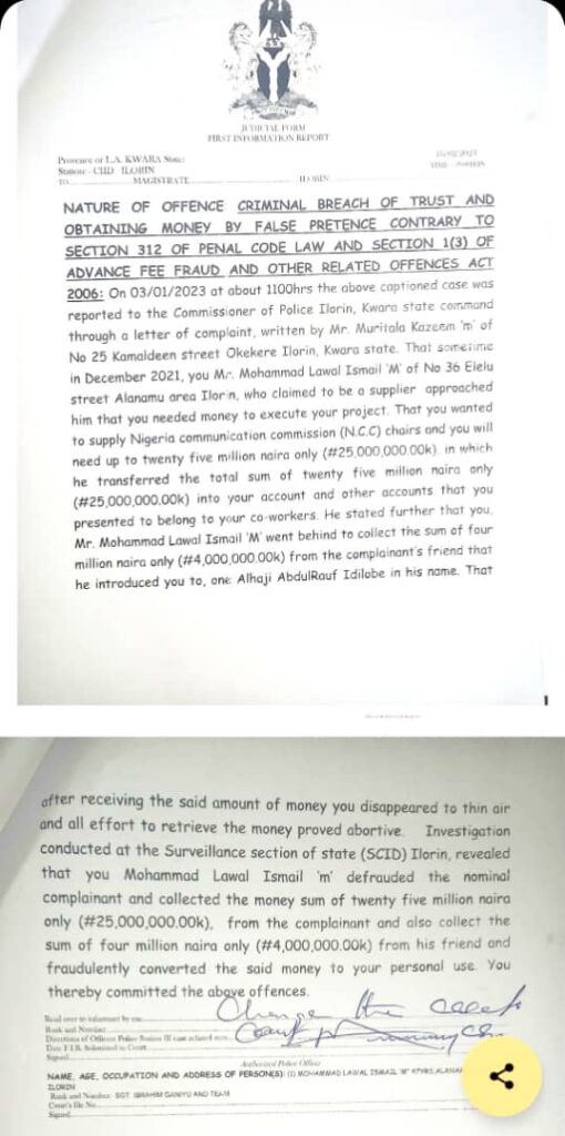 “On 03/01/2023 at about 1100hrs the above captioned case was reported to the Commissioner of Police Ilorin, Kwara state command through a letter of complaint, written by Mr. Muritala Kazeem ‘m’ of No 25 Kamaldeen street Okekere Ilorin, Kwara state. That sometime in December 2021, you Mr. Mohammad Lawal Ismail ‘M’ of No 36 Elelu street Alanamu area Ilorin, who claimed to be a supplier approached him that you needed money to execute your project. That you wanted to supply Nigeria communication commission (N.C.C) chairs and you will need up to twenty five million naira only(#25,000,000.00k), in which he transferred the total sum of twenty five million naira only(#25,000,000.00k) into your account and other accounts that you presented to belong to your co-workers”