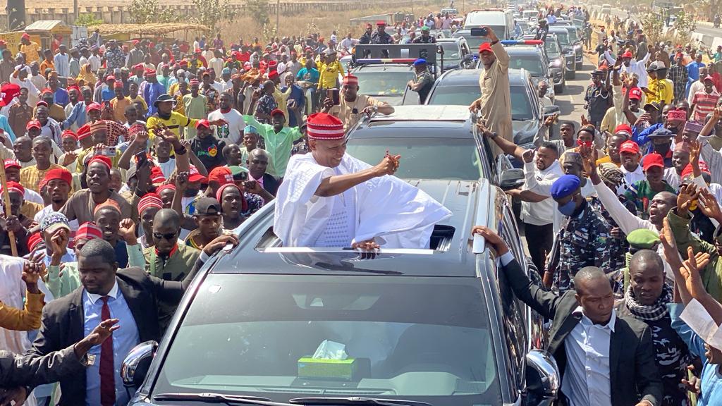 Thousands of well wishers and supporters thronged out on Sunday to cheer him as he departs Kaduna for Kano.