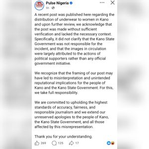 Pulse Nigeria has issued a public apology and clarification following widespread backlash over its earlier report suggesting that the Kano State Government distributed underwear to women as empowerment materials.